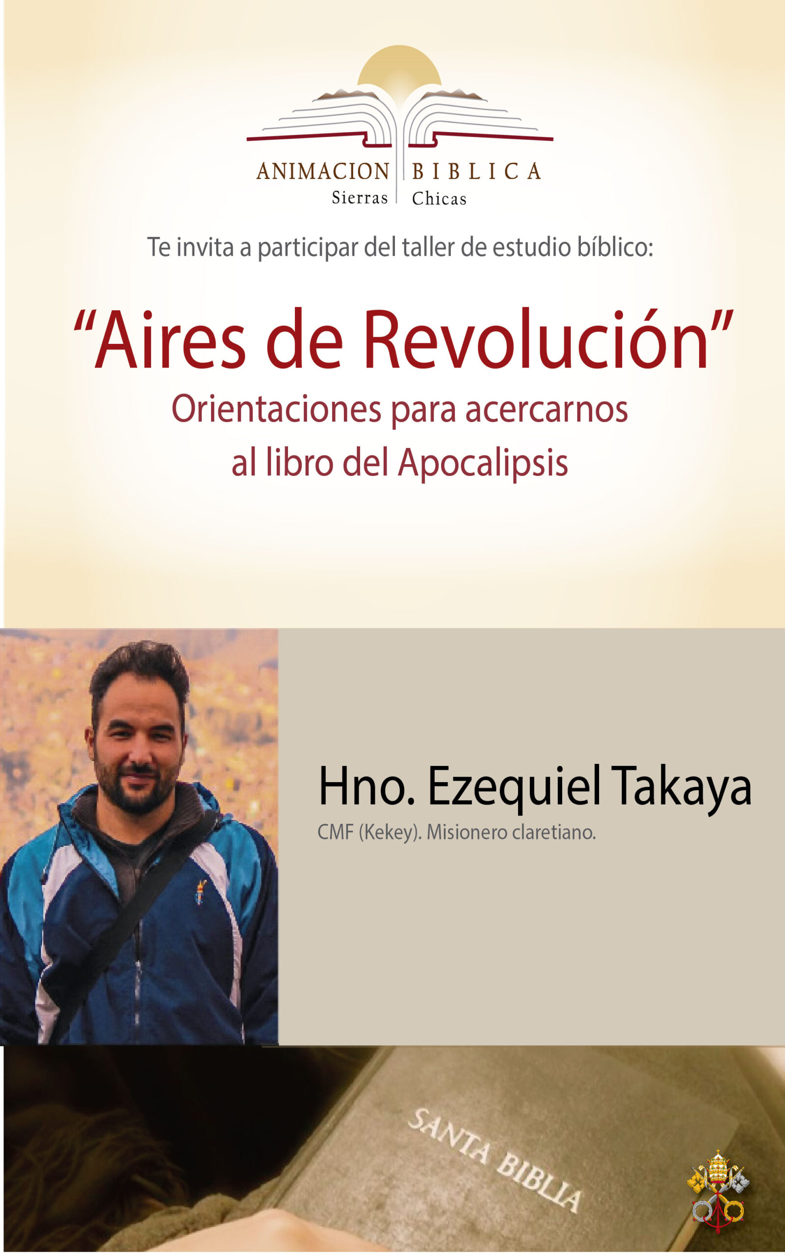 Aires de Revolución Taller especial introductorio «Aires de Revolución». Orientaciones para acercarnos al libro del Apocalipsis. Dictado por: Hno. Ezequel Takaya – CMF (Kekey). Misionero Claretiano. Actividad libre y gratuita.Utilizaremos Bíblia, cuaderno y lapicera. Volver