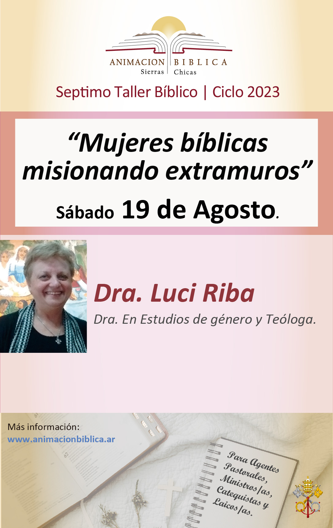 Mujeres bíblicas misionando extramuros Mujeres bíblicas misionando extramuros. Dictado por: Dra. Luci Riba – Dra. en Estudios de género y Teóloga. Sábado 19 de Agosto, 16hs.Actividad libre y gratuita. ¡IMPORTANTE! No olvides completar la siguiente actividad luego que veas el video. ACTIVIDAD Volver